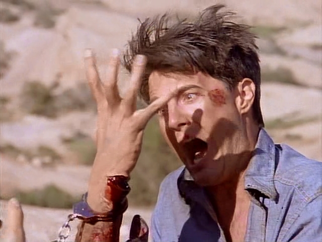 Kyle McLachlan’s performance becomes increasingly frustrating as Diggs quickly tires out, both physically and existentially. He never gets to suck the handcuffed guy’s cock – the desert drives him insane. Likewise, the violence on screen isn’t vicious or exaggerated, but it’s not sexy at all. For those who think Tales from the Crypt is a horror-comedy show about hot sex, “Death by Corruption” is a grim reminder that the show can be deadly serious.